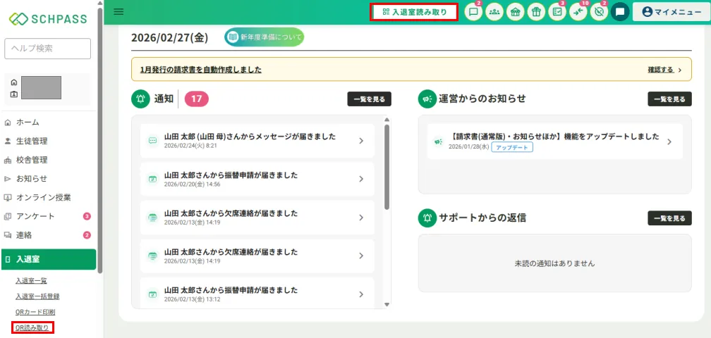 【入退室】QR読み取り画面を表示したい生徒の入退室QRコードを読み取る画面の表示方法です。管理画面>「入退室読み取り」ボタンまたは、サイドメニュー「入退室」>「QR読み取り」をクリックするとQRコード読み取り画面を表示できます。