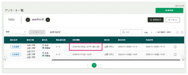 アンケート一覧画面で回答期限までの残り日数を確認できます。