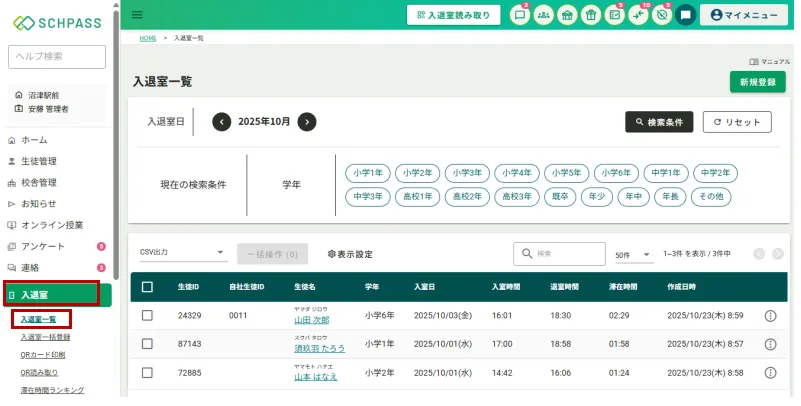 管理画面>サイドメニュー「入退室」>「入退室一覧」をクリックし入退室一覧画面を表示します。