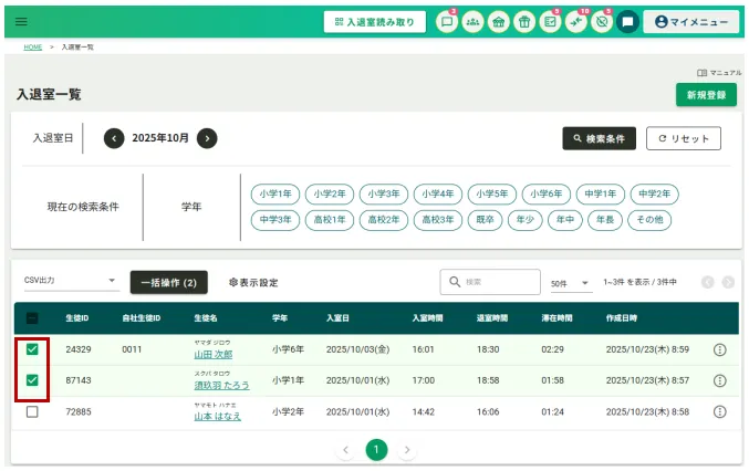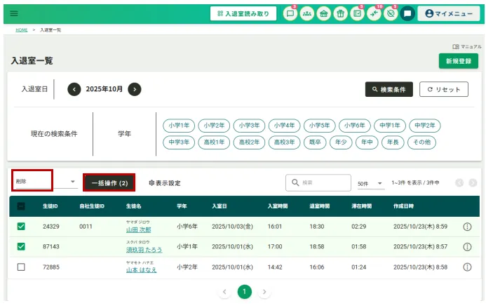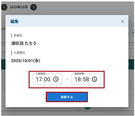 生徒の入室時間、退室時間をあとから編集、削除する方法を説明します。