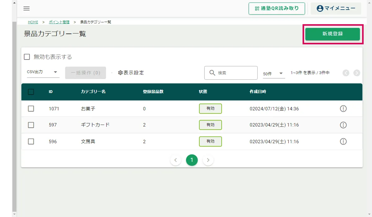 サイドメニュー「ポイント」>「設定」>「景品カテゴリ設定」をクリックし景品カテゴリー一覧画面を表示します。