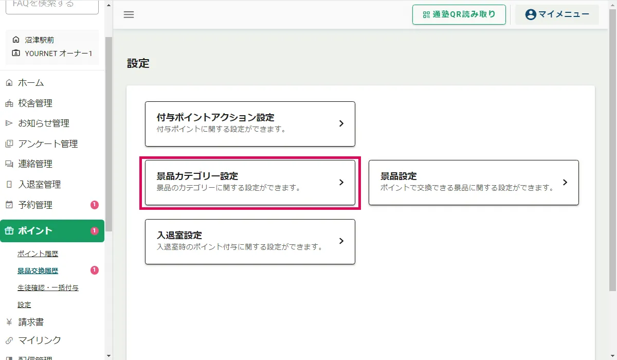 1.景品カテゴリー一覧画面を表示