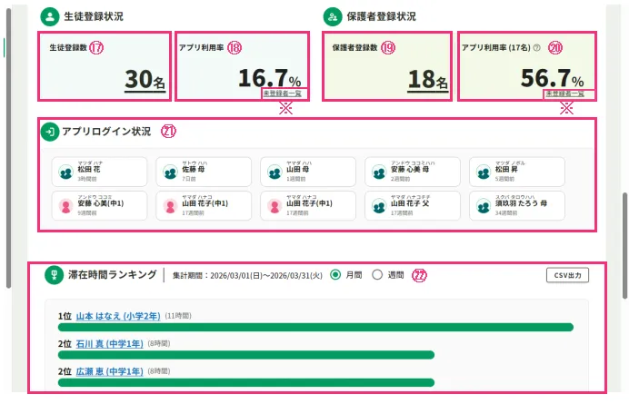 ⑳生徒数に対し、保護者アカウントが作成されている生徒の割合が確認できます。()内は保護者アカウントに紐づいている生徒の人数です。