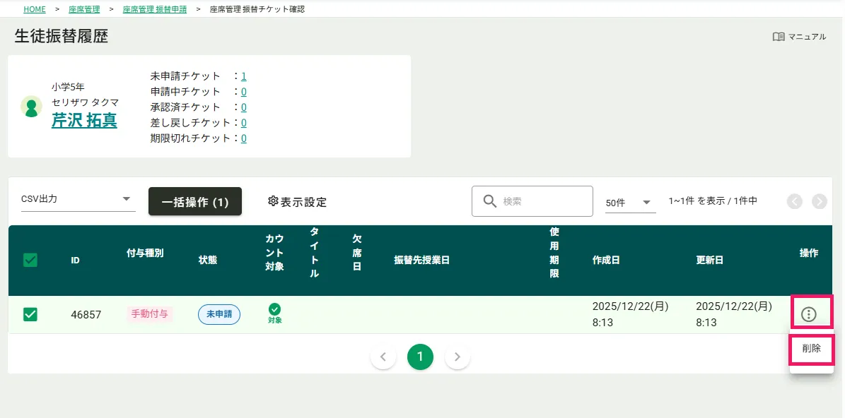 チケットを付与したい生徒にチェックを入れます。
