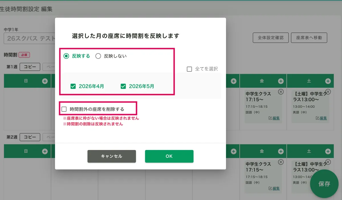 ※時間割の削除も反映させたい場合は「時間割外の座席を削除する」にチェックを入れます。