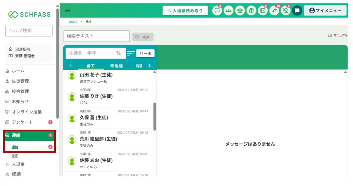 1.スクパス管理画面のサイドメニュー「連絡」>「連絡」をクリックし、連絡画面を表示します。