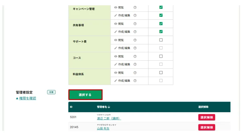 画面を下にスクロールし、管理者設定の「選択する」をクリックし、管理者選択画面を表示します。