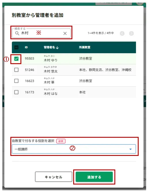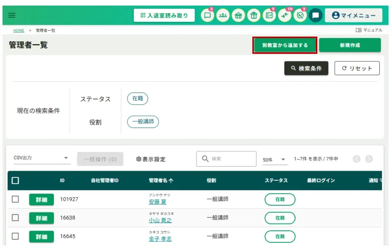 「別教室から追加する」をクリックし、別教室から管理者を追加する画面を表示します。