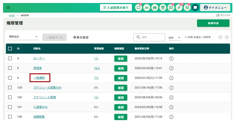 サイドメニュー「校舎管理」>「管理者管理」の「権限管理」をクリックし権限管理画面を表示します。