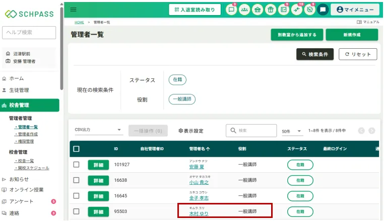 サイドメニュー「校舎管理」>「管理者管理」の「管理者一覧」を表示し、役割を設定した管理者(講師)が一覧に表示されているかを確認します。