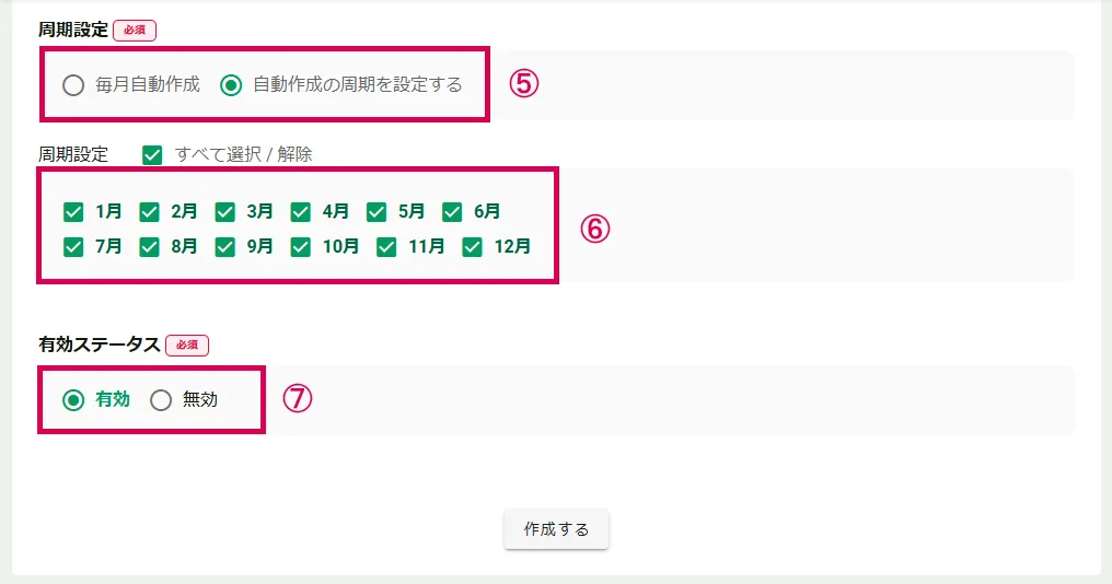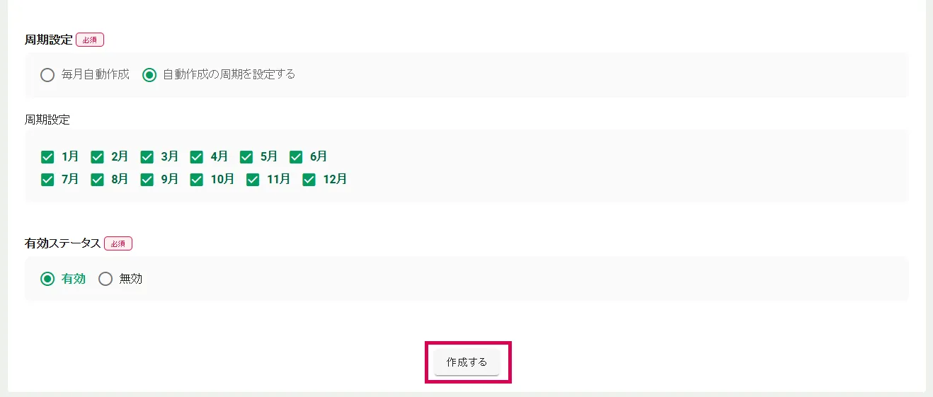 ※周期設定のチェックはその月に「自動作成を実行するか、しないか」です。