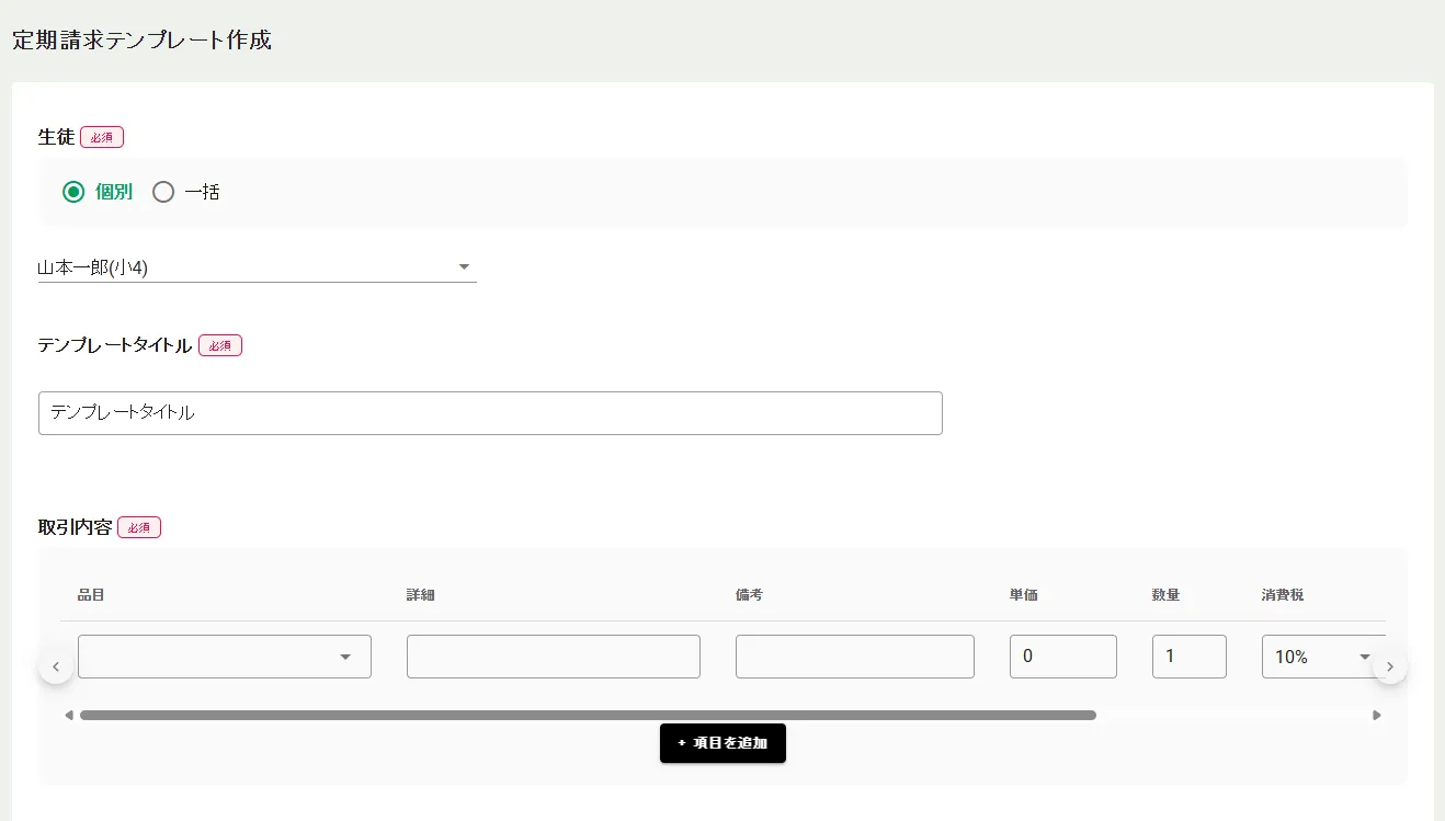 定期請求テンプレートを使用することで、前月の請求書の内容にかかわらず、決まった内容の請求書を自動作成することができます。ここでは定期請求テンプレートの作成方法を説明します。