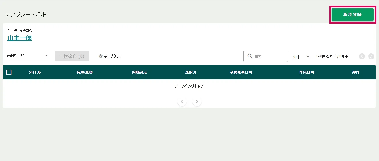 サイドメニュー「請求書」>「設定」>「定期請求テンプレート設定」をクリックし、定期請求テンプレート一覧画面を表示します。