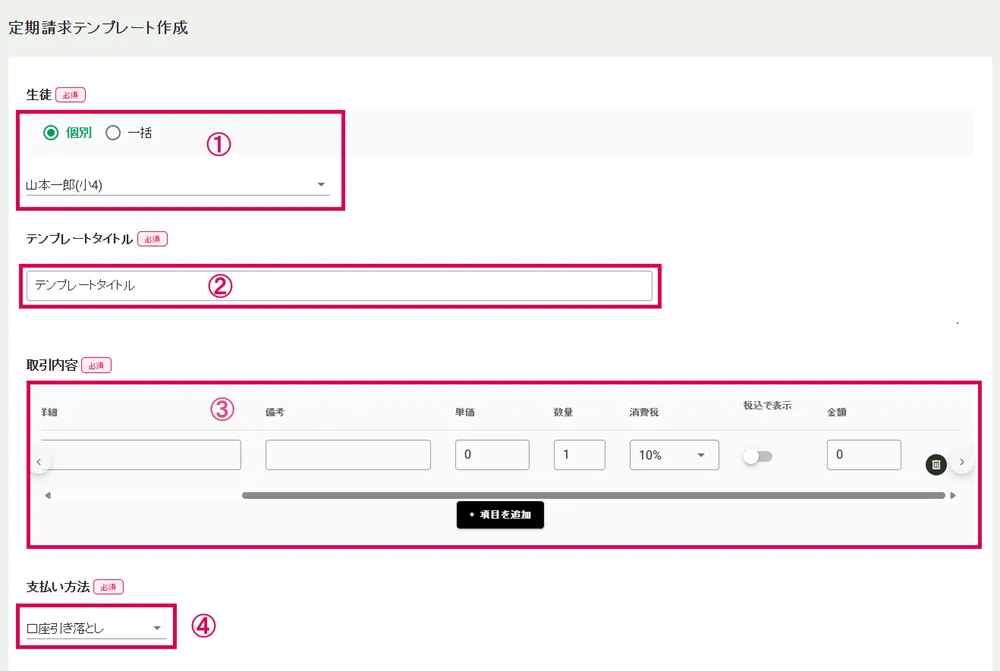 ②テンプレートタイトルは請求書には表示されません。テンプレートを識別するための名称です。