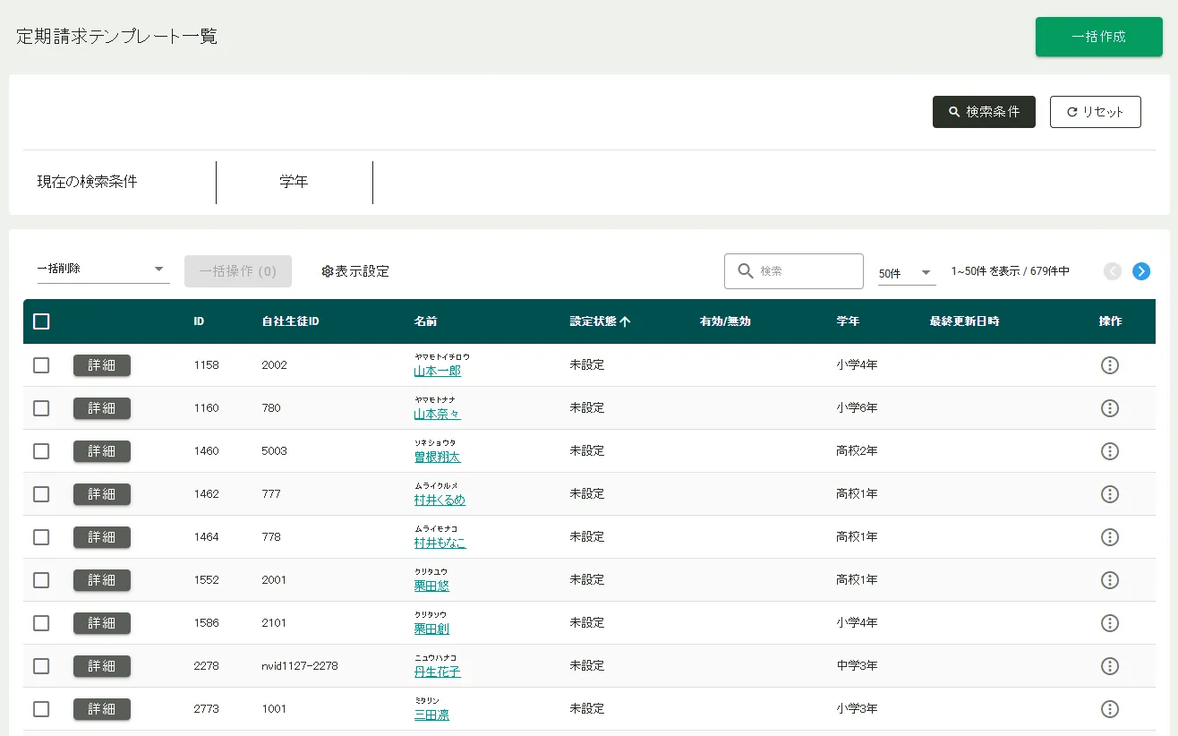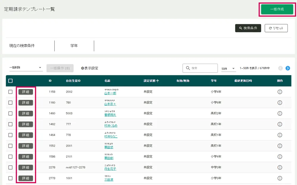「一括作成」ボタン、または作成したい生徒の「詳細ボタン」>「新規登録」ボタンをクリックします。