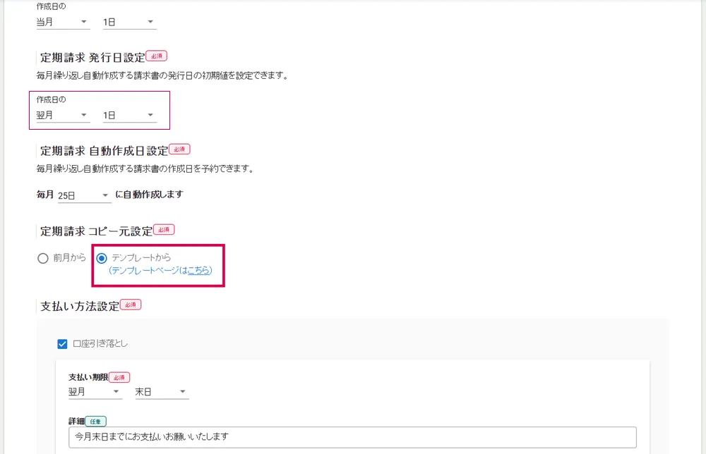 定期請求テンプレートを使用して請求書を自動作成するための設定方法について説明します。