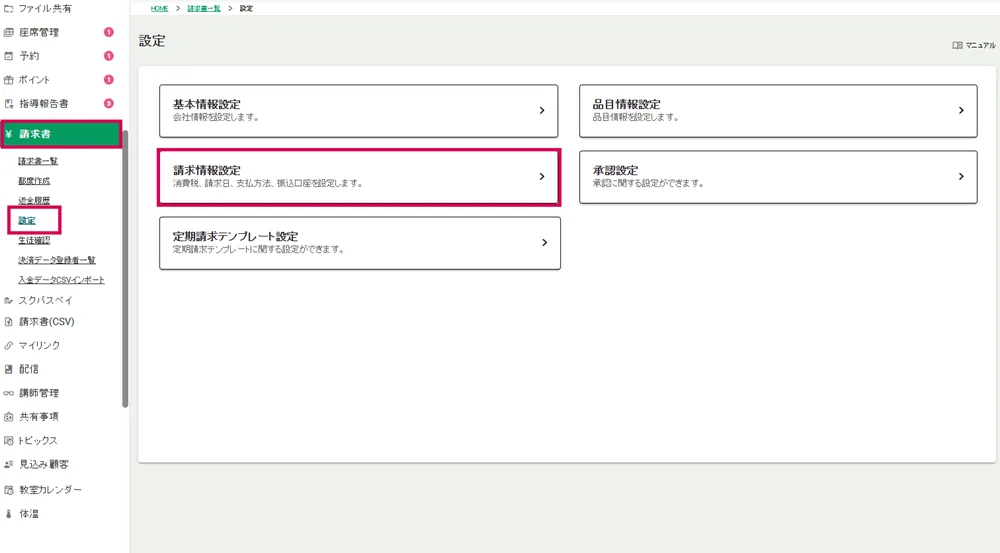 サイドメニュー>請求書>設定をクリックし設定画面を表示し、「請求情報設定」をクリックします。