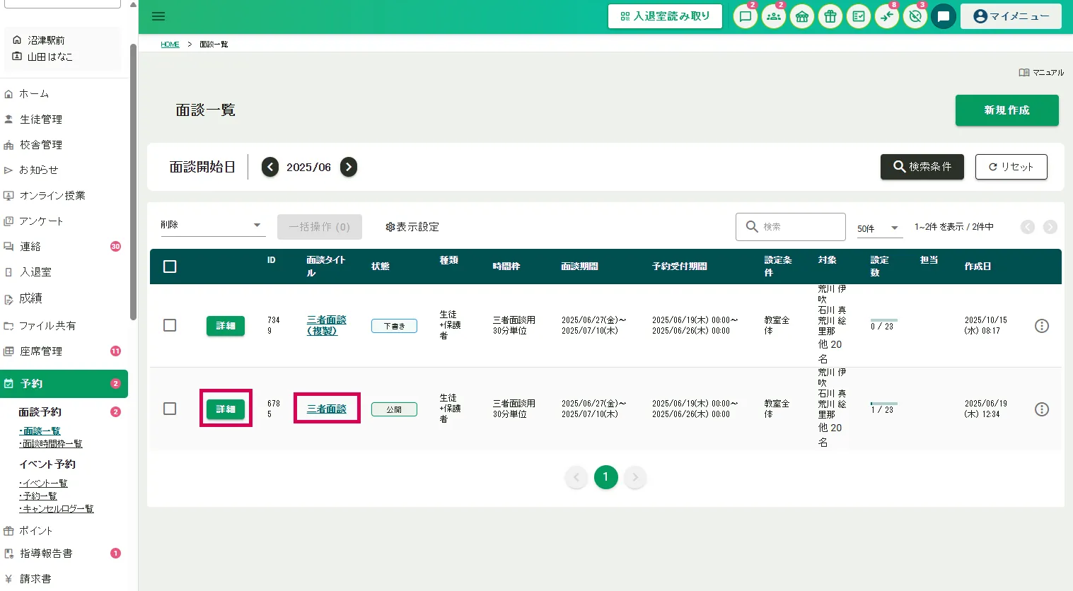 対象生徒を削除したい面談予定の「面談タイトル」または詳細ボタンをクリックして面談詳細画面を表示します。