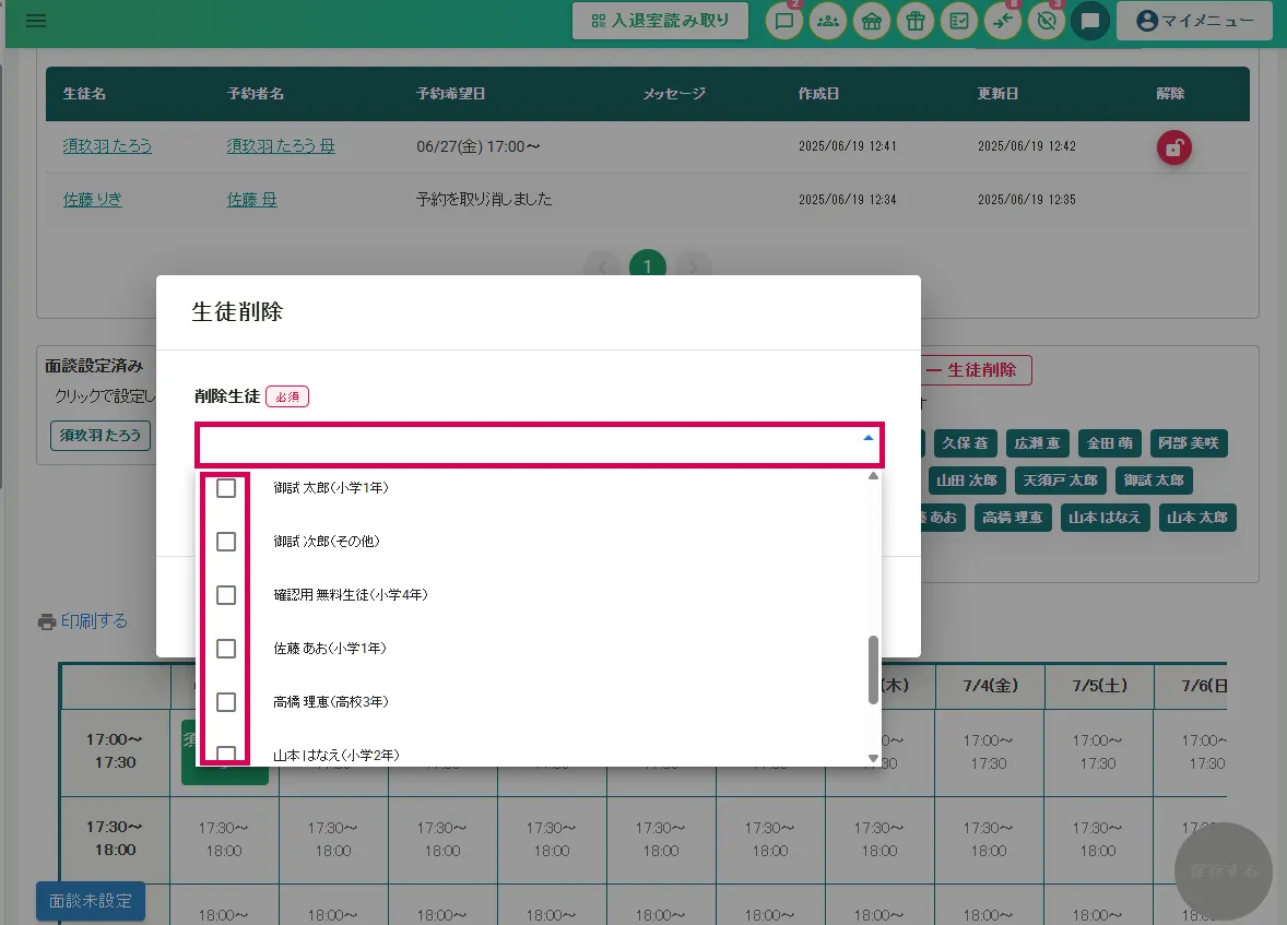 ②削除生徒入力欄をクリックし、一覧の中から削除したい生徒にチェックを入れます。(枠外をクリックすると生徒一覧が閉じます)