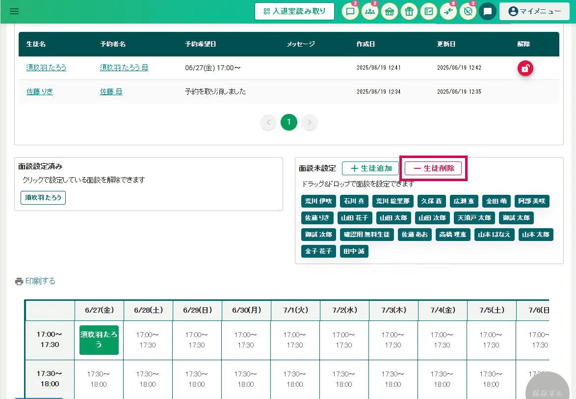 面談予定を作成後に対象生徒を削除する方法を説明します。