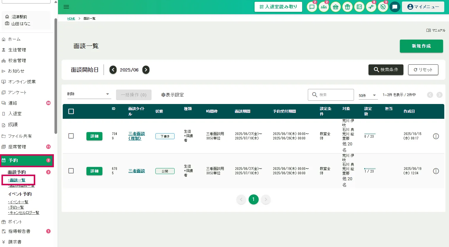 サイドメニュー「予約」>「面談予約」>「面談一覧」をクリックして面談一覧画面を表示します。