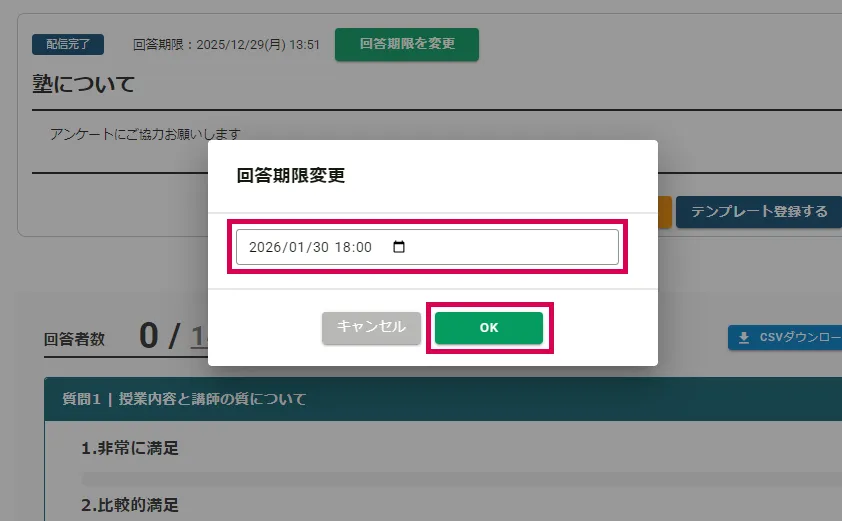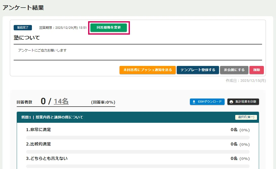 管理画面のサイドメニュー「アンケート」>「一覧」>「タイトル」をクリックし、アンケート結果画面を表示します。