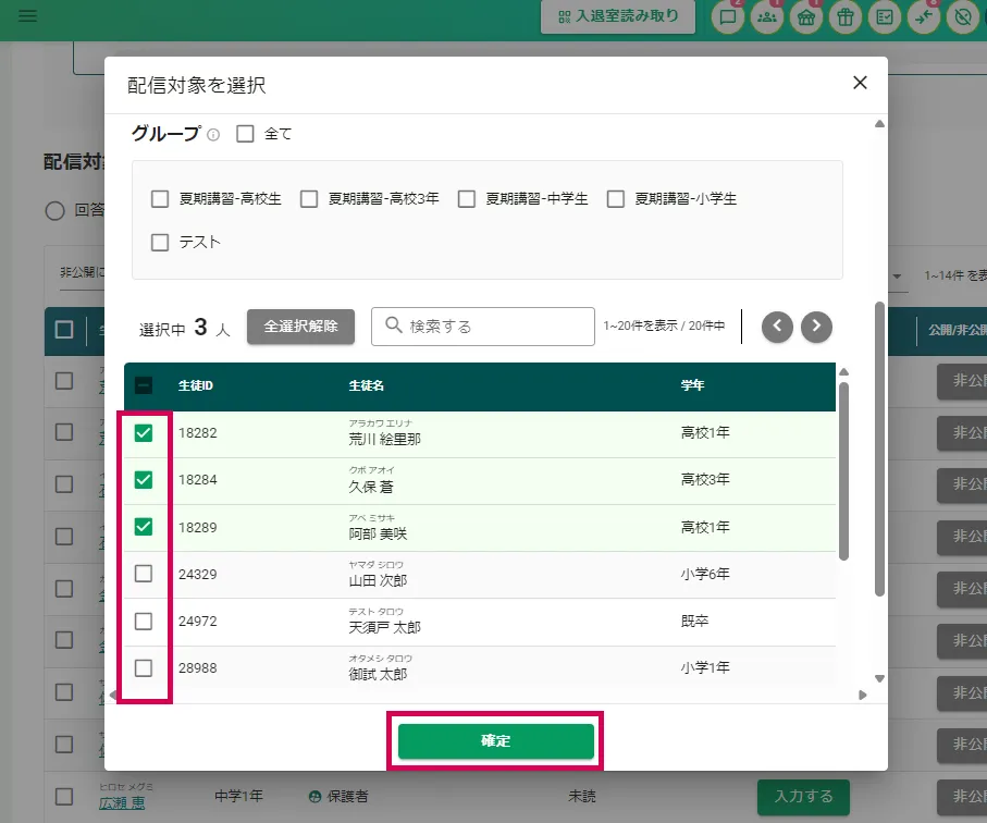 ※配信先に保護者を選択している場合、生徒を選択すれば保護者も対象者に含まれます。