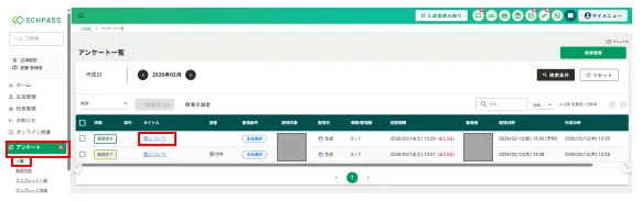 ①サイドメニュー「アンケート」>「一覧」>「アンケート一覧」画面で、リマインド通知を設定したいアンケートをクリックします。