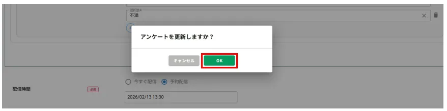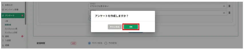 ⑤「作成する」>「OK」をクリックしてアンケートを配信します。