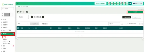 ①サイドメニュー「アンケート」>「一覧」>画面右上の「新規作成」をクリックします。または、「アンケート」>「新規作成」をクリックし、アンケート作成画面を表示します。
