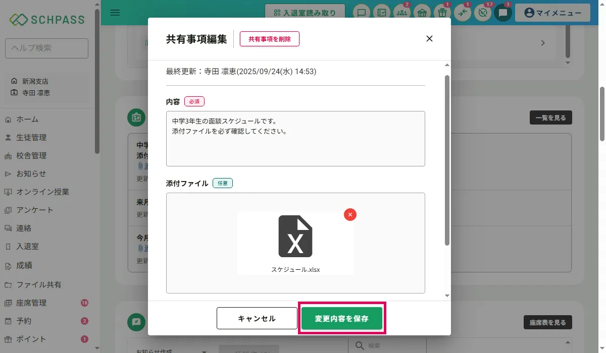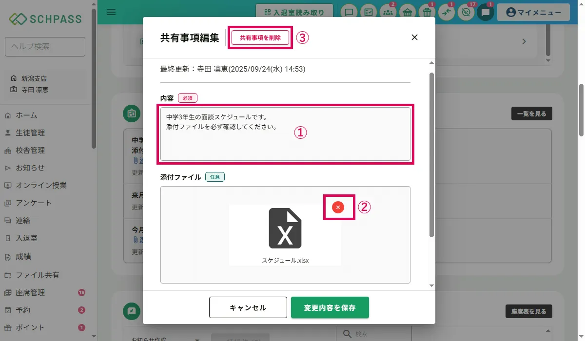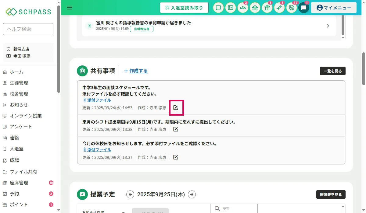 編集したい共有事項の編集アイコンをクリックし、共有事項編集画面を表示します。