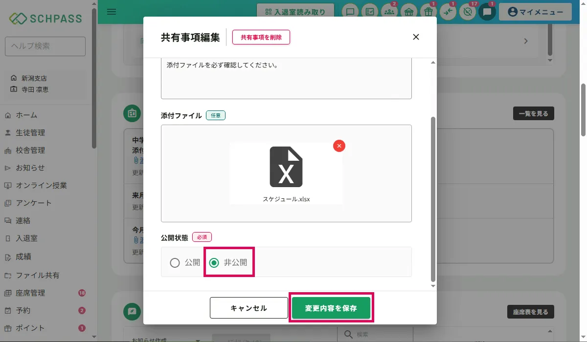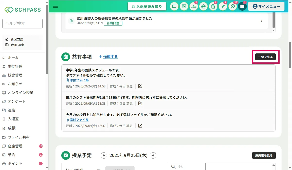 ※非公開にした共有事項は「一覧を見る」から確認でき、再度公開することもできます。