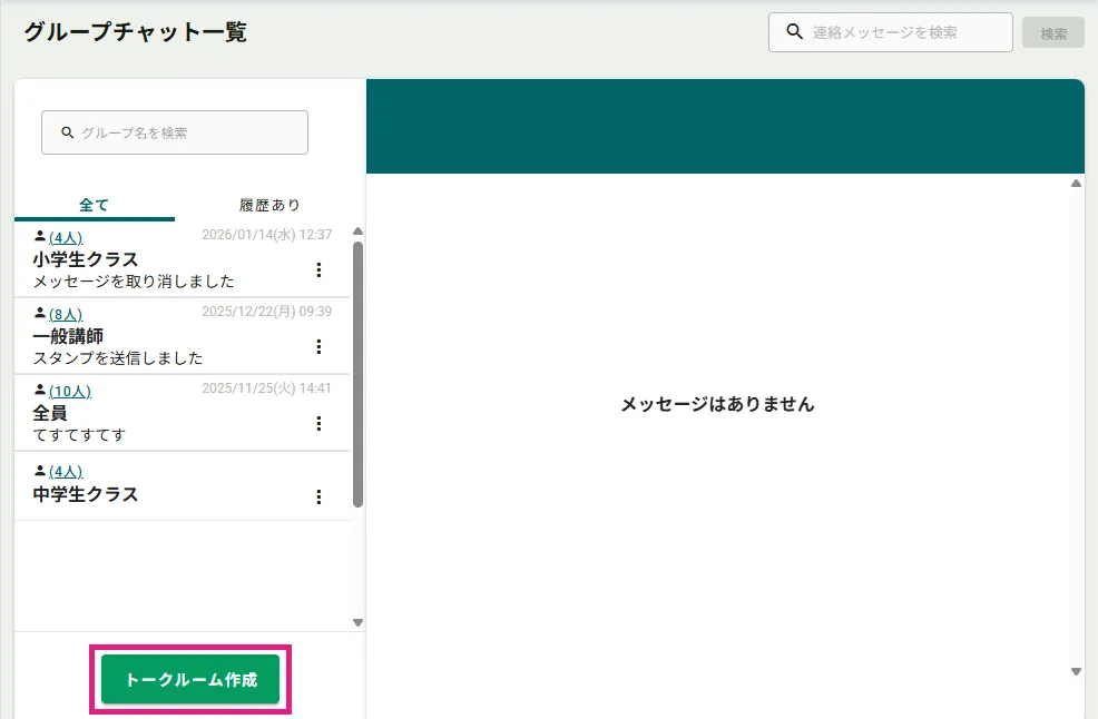 サイドメニュー「講師管理」>「講師連絡」>「グループチャット一覧」をクリックし、グループチャット一覧画面を表示します。