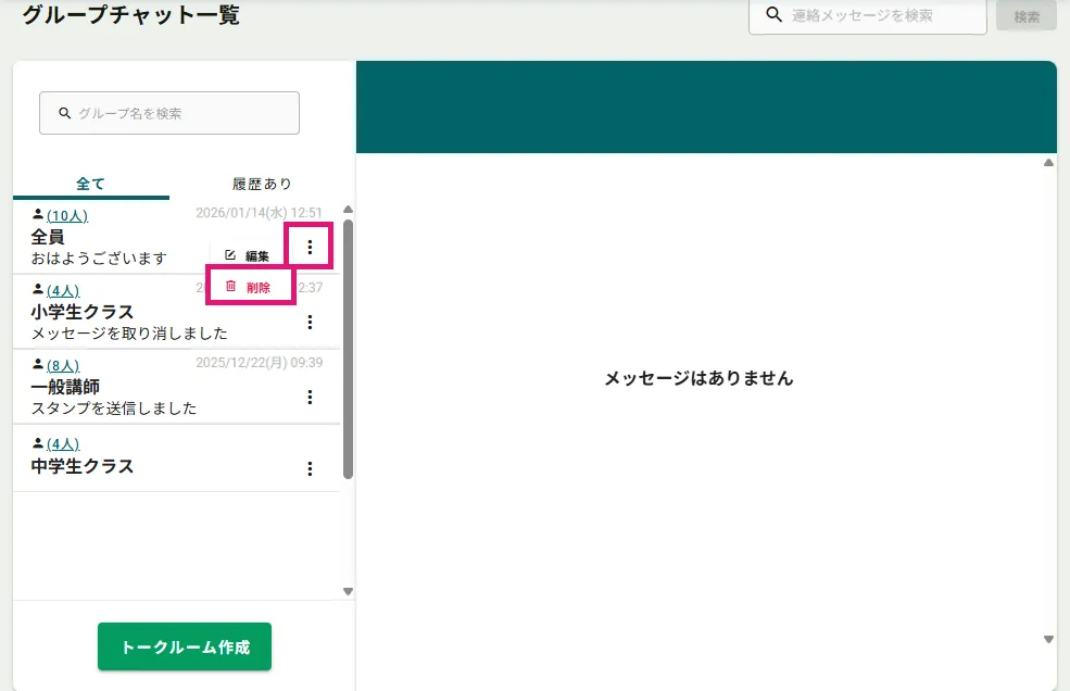 管理者・講師のグループチャットのトークルームを作成する方法、編集や削除する方法を説明します。