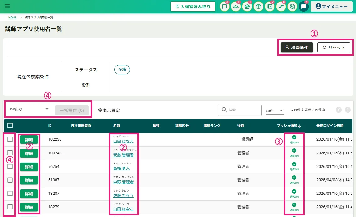 ①ステータスと役割を指定して講師を検索できます。「リセット」ボタンをクリックすると検索条件をリセットできます。