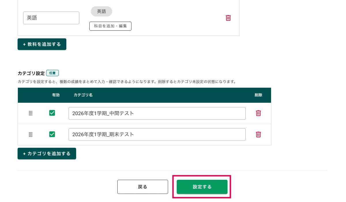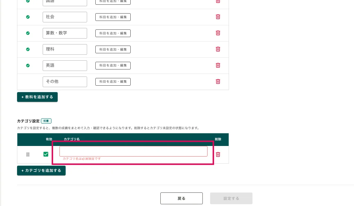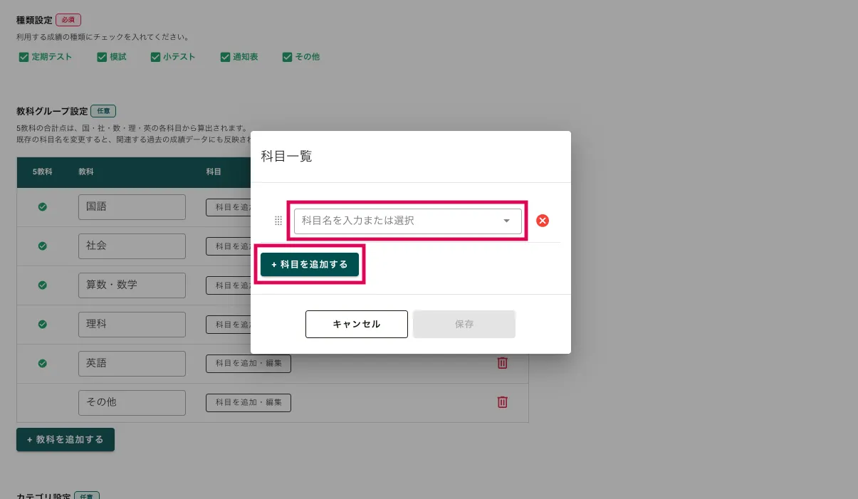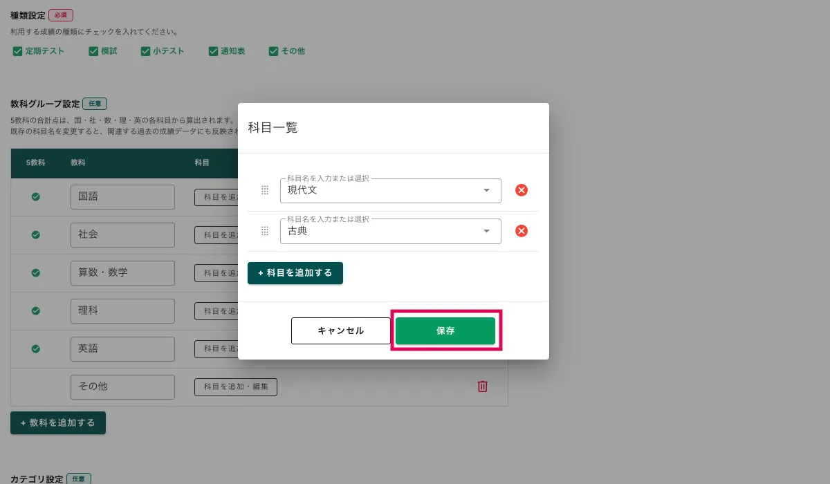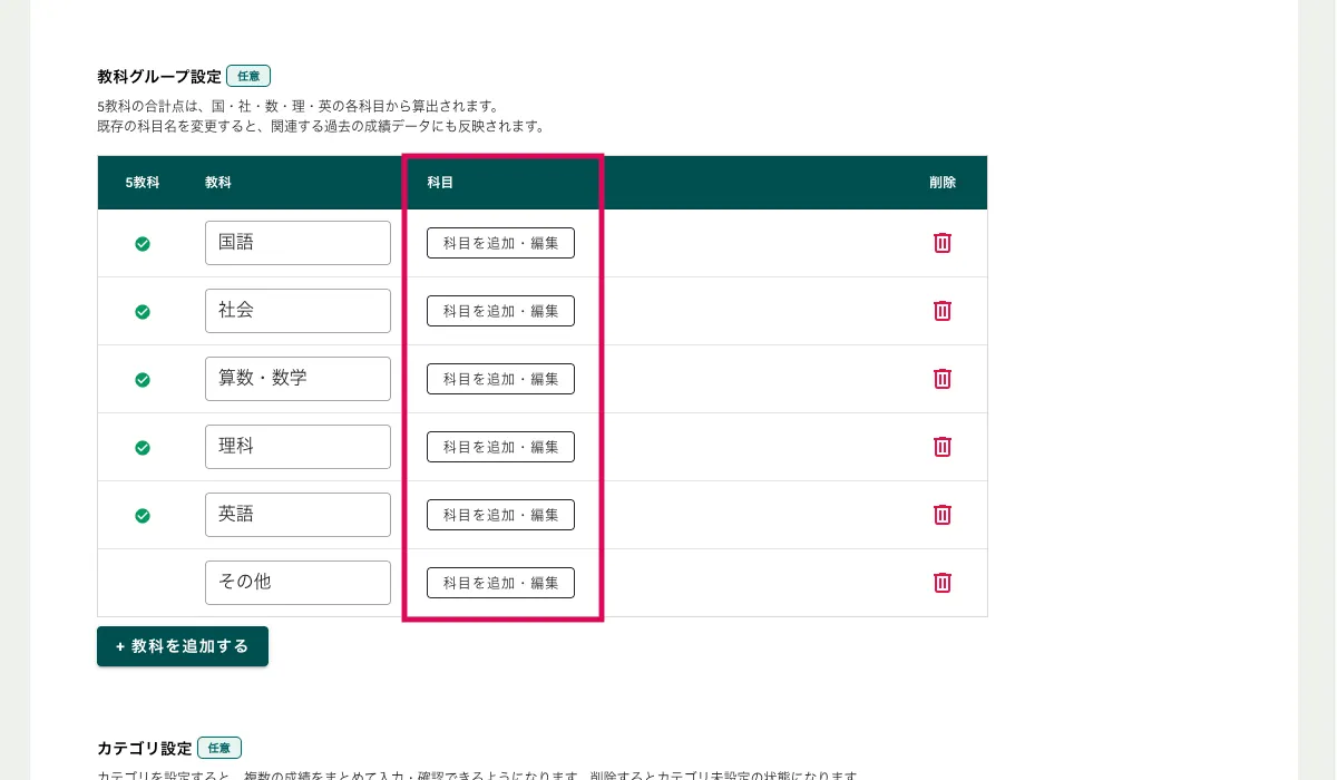 ・5教科の教科グループは削除できません。該当する科目がない場合は、科目を紐づけずに設定を進めて問題ありません。なお「+教科を追加する」ボタンから新しい教科グループを作成することも可能です。