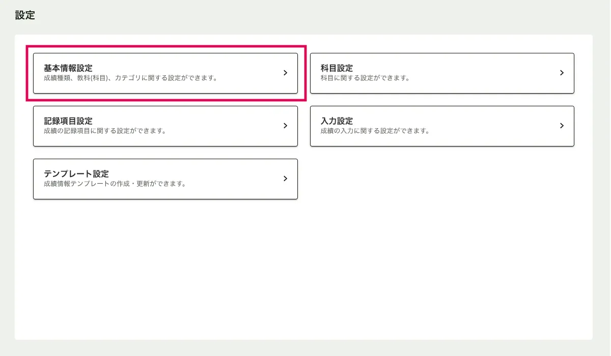 サイドメニュー「成績」>「設定」>「基本情報設定」をクリック