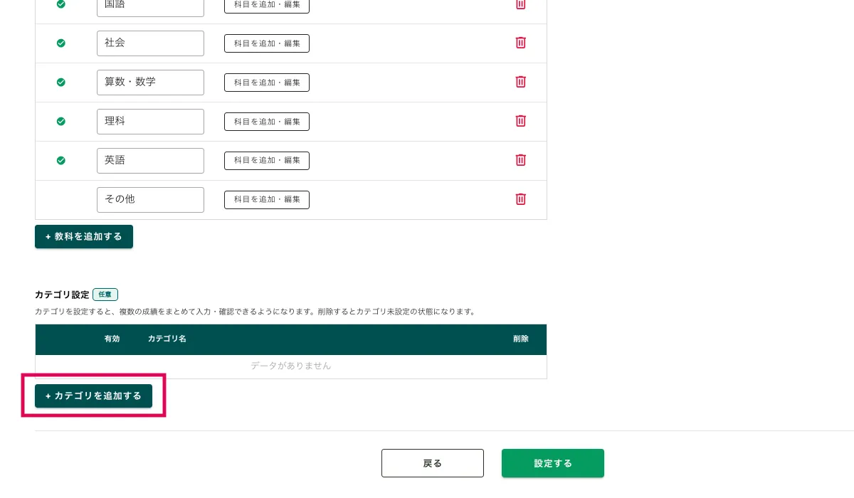 ・それぞれの教科の「科目を追加・編集」ボタンをクリック