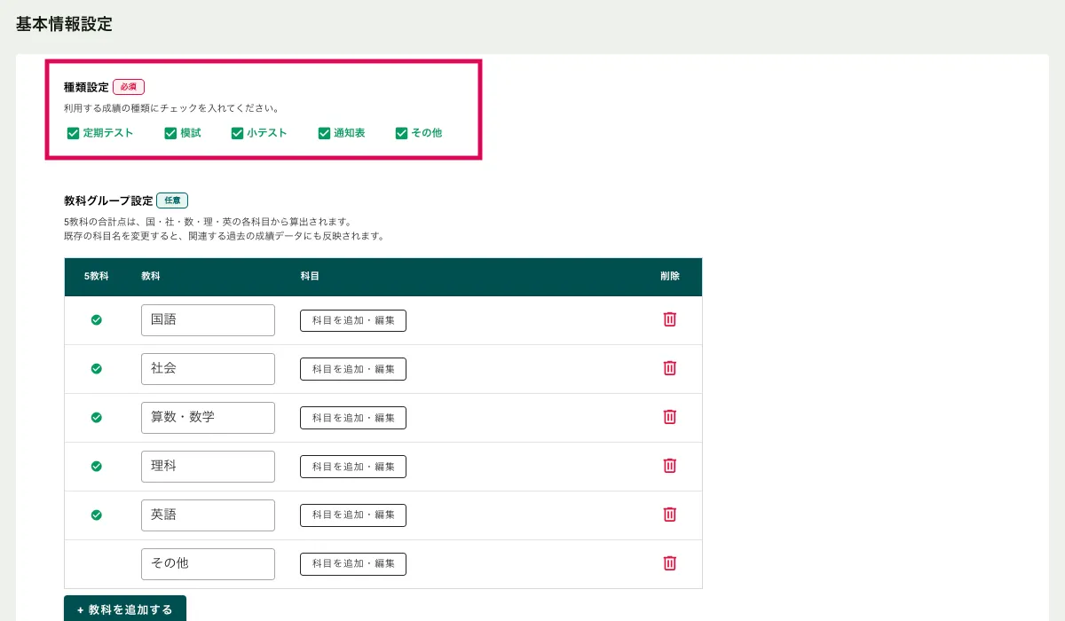 デフォルトでは5教科(国語、算数・数学、理科、社会、英語)+「その他」の教科グループが設定されています。