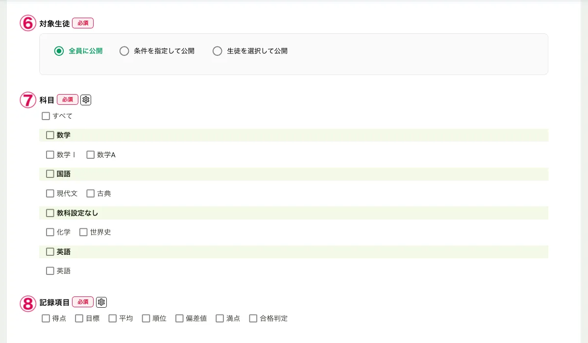 ⑥公開対象:成績記録を公開する対象を選択してください。