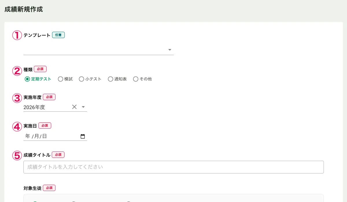 ⑤成績タイトル:テスト名など、成績のタイトルを入力してください、