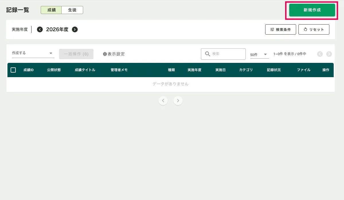 ・サイドメニュー「成績」>「記録一覧」>画面右上「新規作成」をクリック