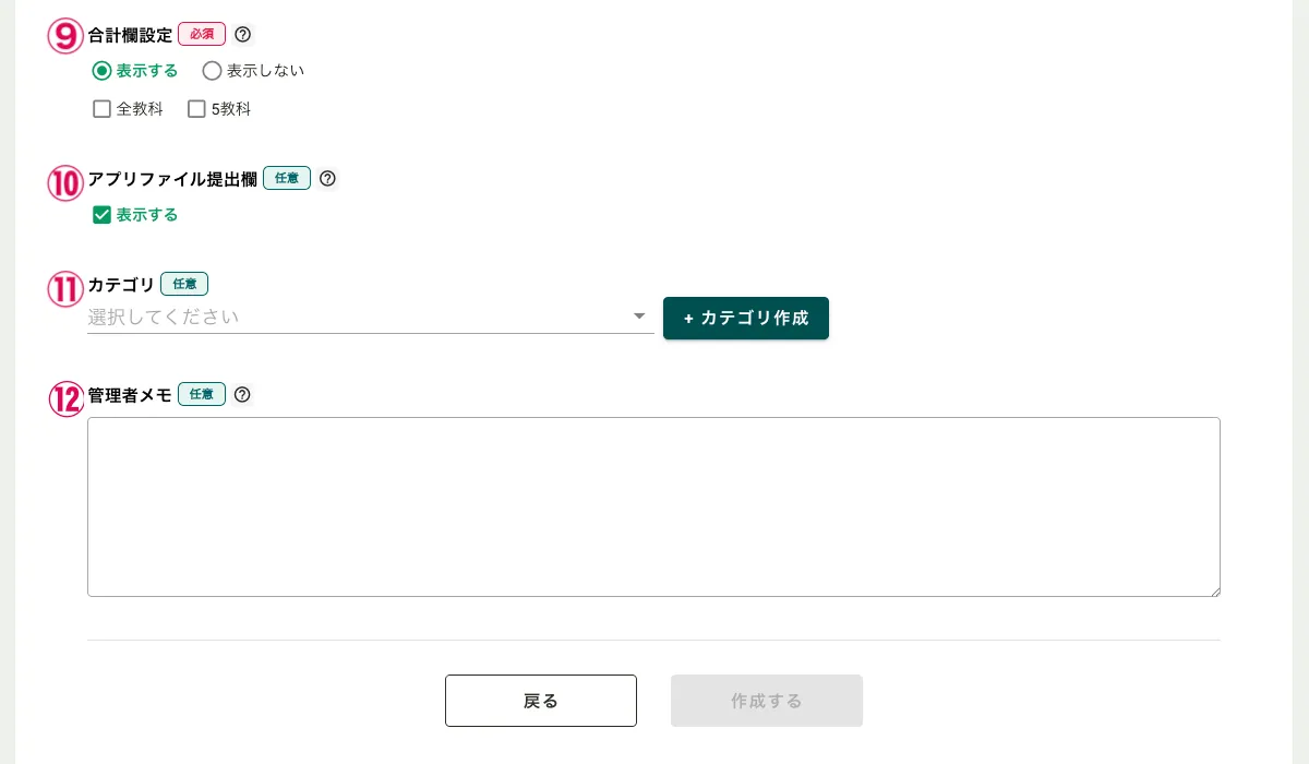 ⑩アプリファイル提出欄:保護者・生徒アプリ上で、成績に対して解答用紙等の画像やPDFファイルをアップロードすることができます。不要な場合はチェックを外してください。