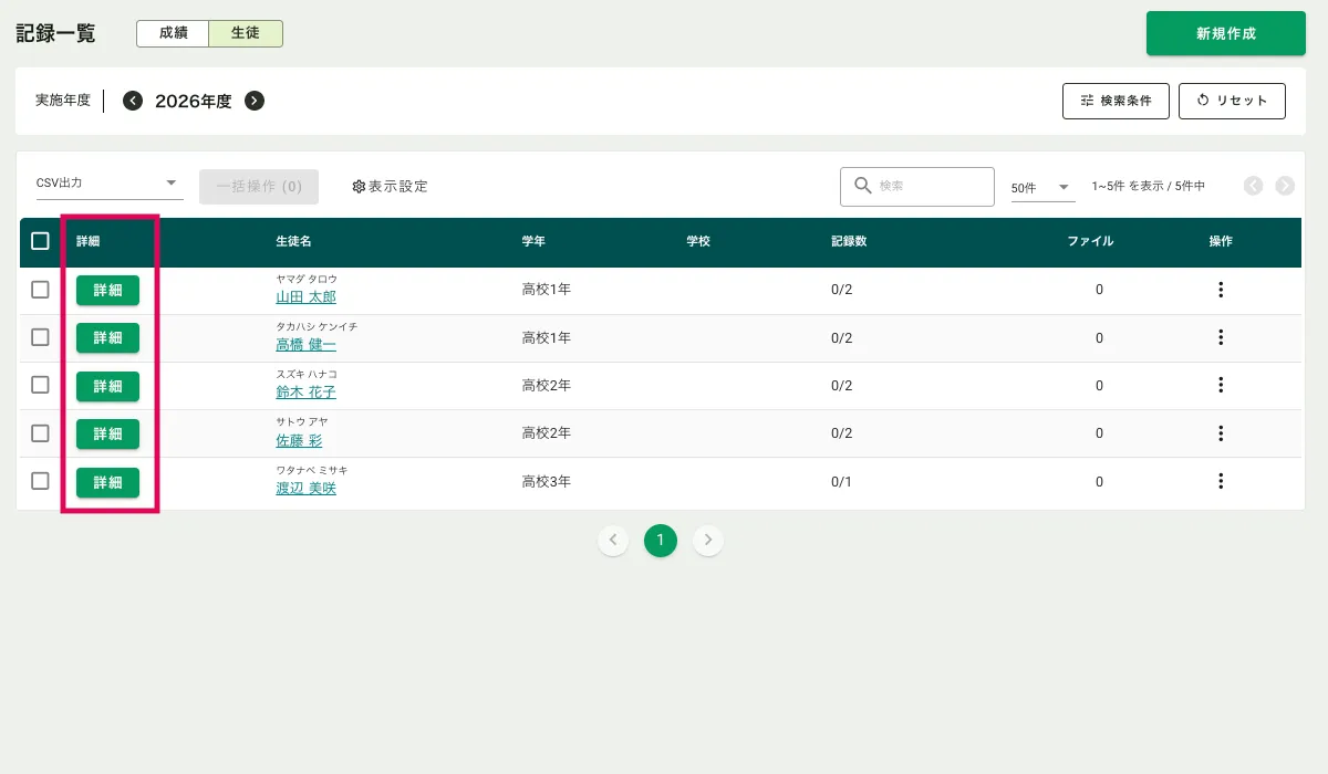 ・該当の生徒の「詳細」をクリックし、詳細画面を開きます。