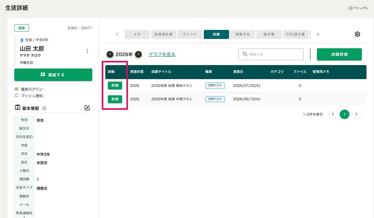 ・生徒管理>生徒一覧>生徒詳細画面の「成績」タブ>「詳細」ボタンからも、生徒別に成績の確認や入力が可能です。