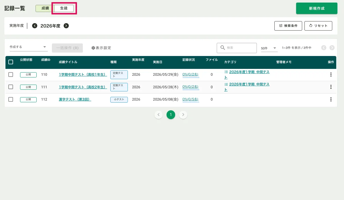 ・サイドメニュー「成績」>「記録一覧」画面左上にある「生徒」をクリックし、表示を生徒別に切り替えます。