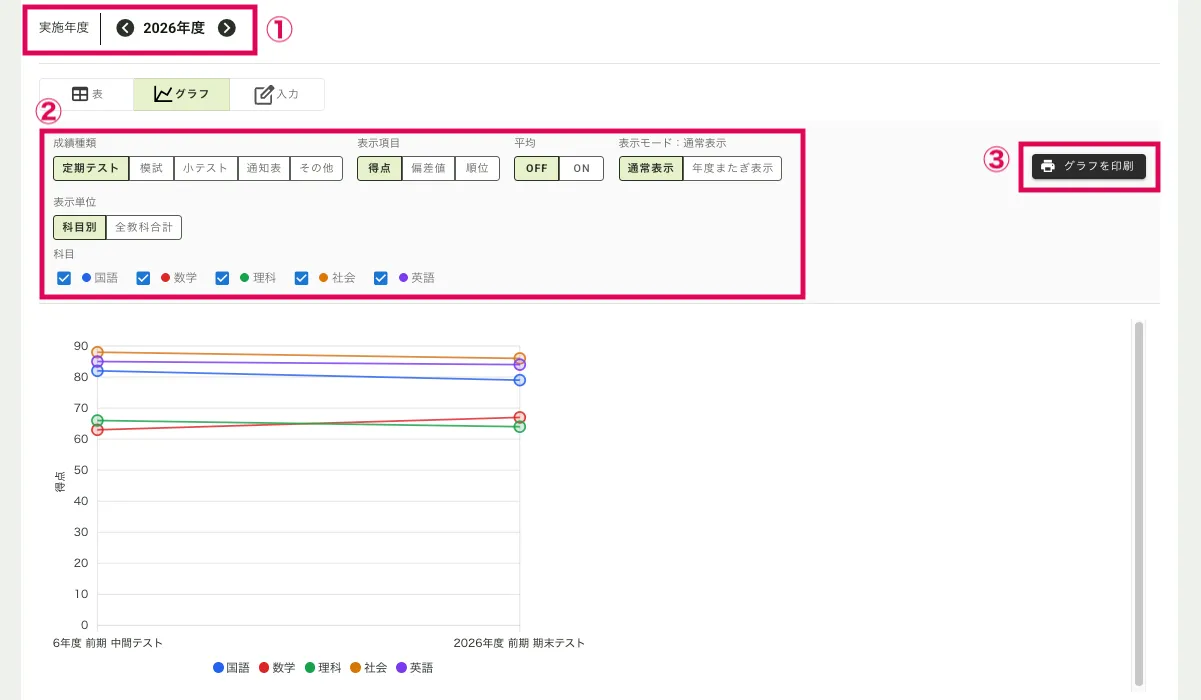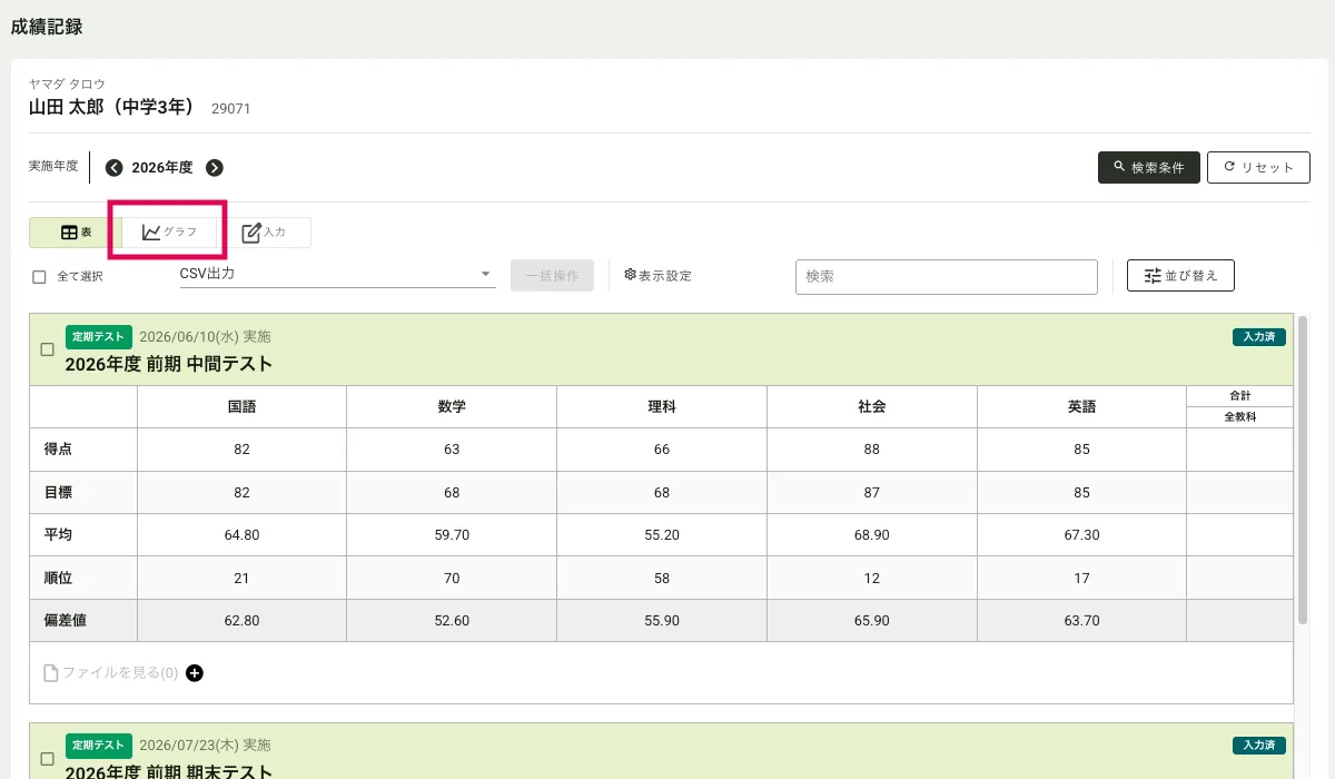 入力した成績を、生徒別にグラフで確認する方法を説明します。グラフは保護者・生徒アプリからも閲覧できます。