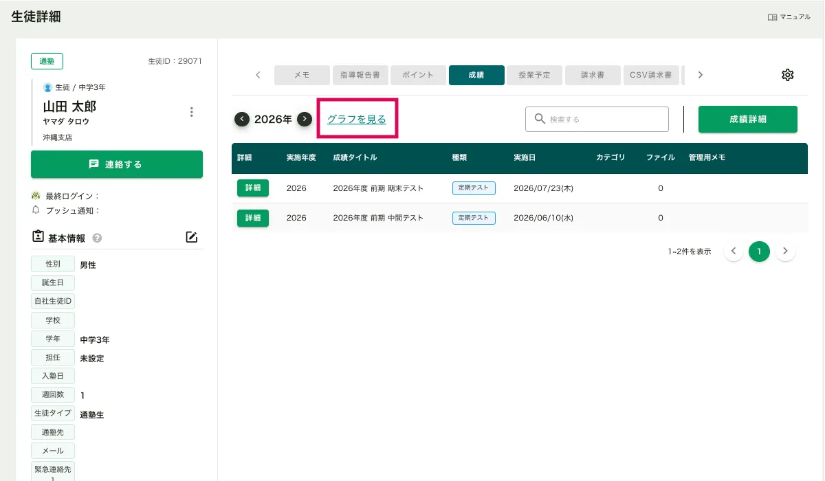 ・生徒管理>生徒一覧>生徒詳細画面>「成績」タブからもグラフを表示することができます。