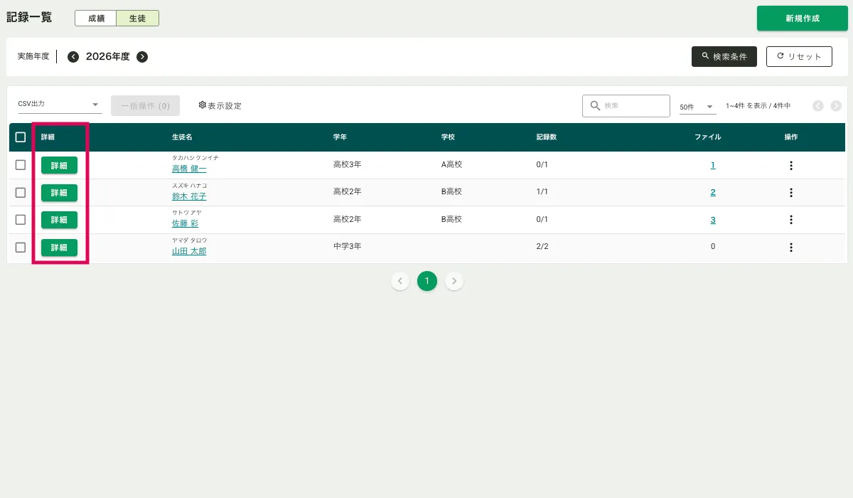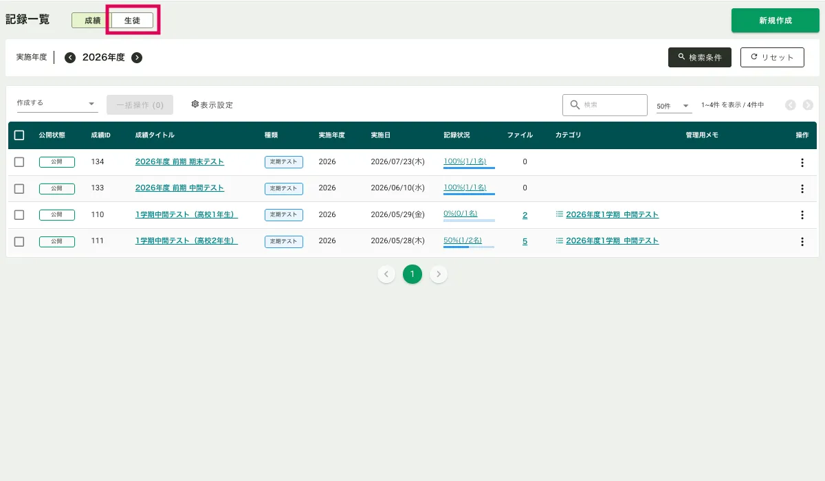 ・サイドメニュー「成績」>「記録一覧」>画面左上「生徒」をクリックして表示を生徒別に切り替えます。
