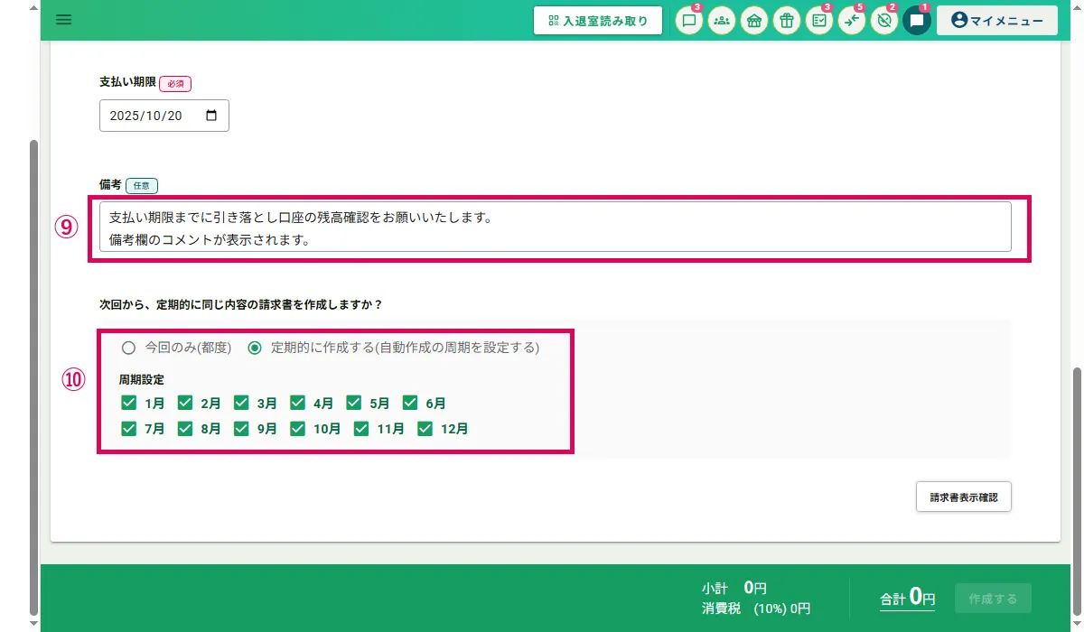 ⑩定期請求するかどうかを選択・・・同じ内容で請求書を繰り返し自動作成する場合は「定期的に作成する」を選択し、作成する月にチェックを入れます。